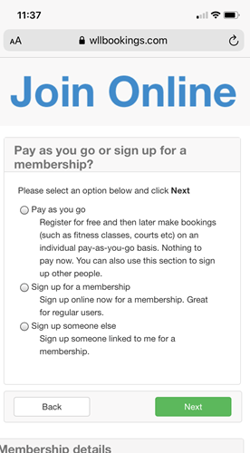 You will be shown the membership options to pick from, select pay as you go or one of our Xcite membership options. For more information on membership options, see here.